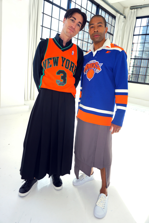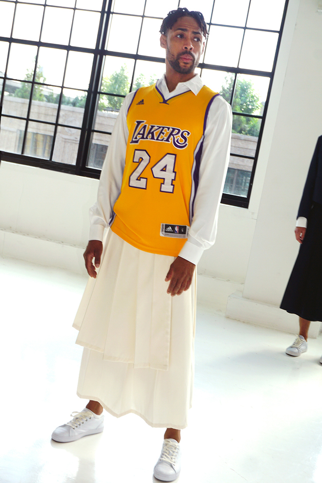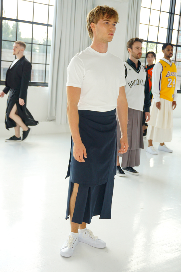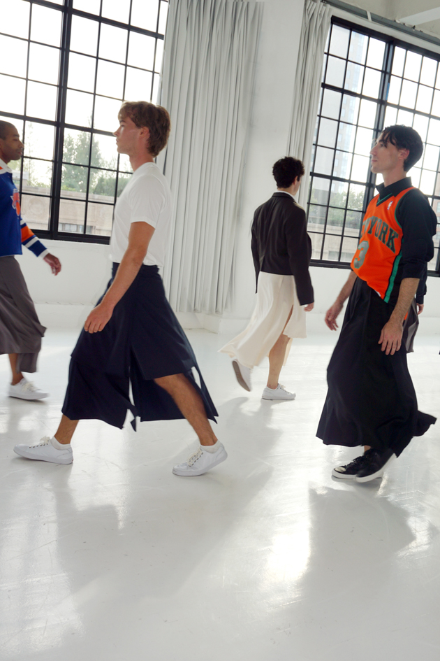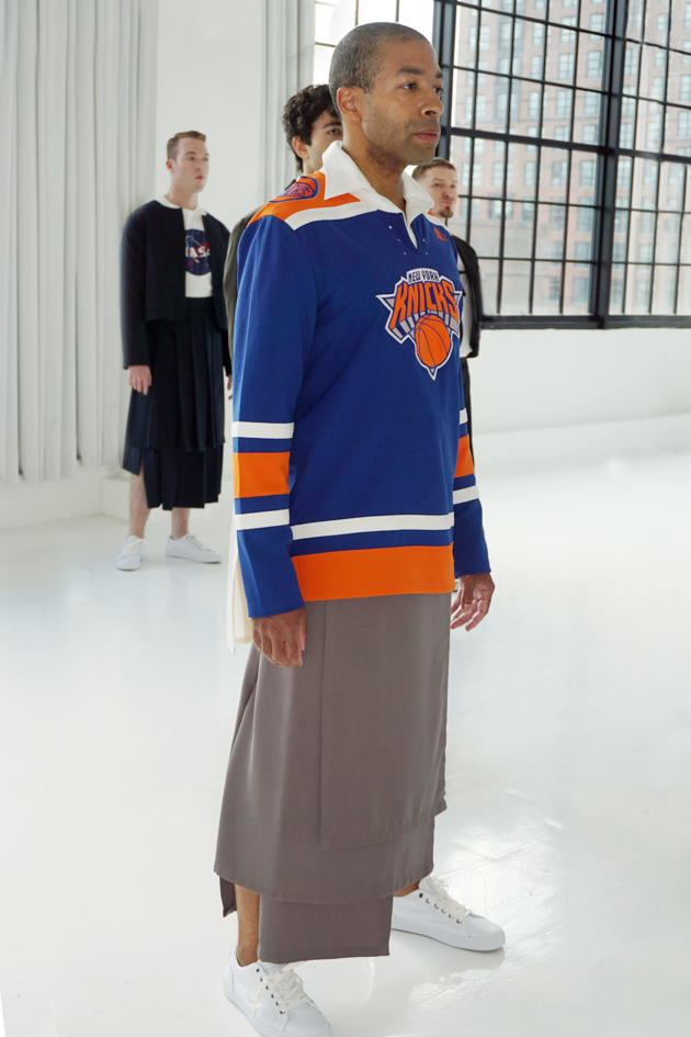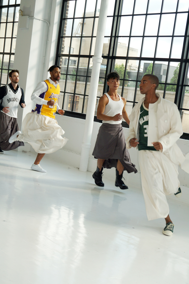 Spectators watched as the dancers performed in Singh’s tailored skirts paired with classic basketball jerseys of his favorite teams. Step by step the dancers presented the clothing with flourish and twirl, as the skirts rotated with movement showing the details of the tailoring.