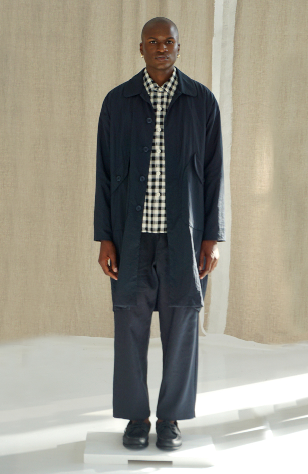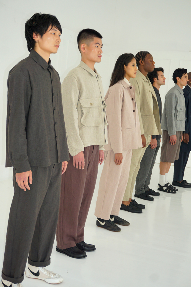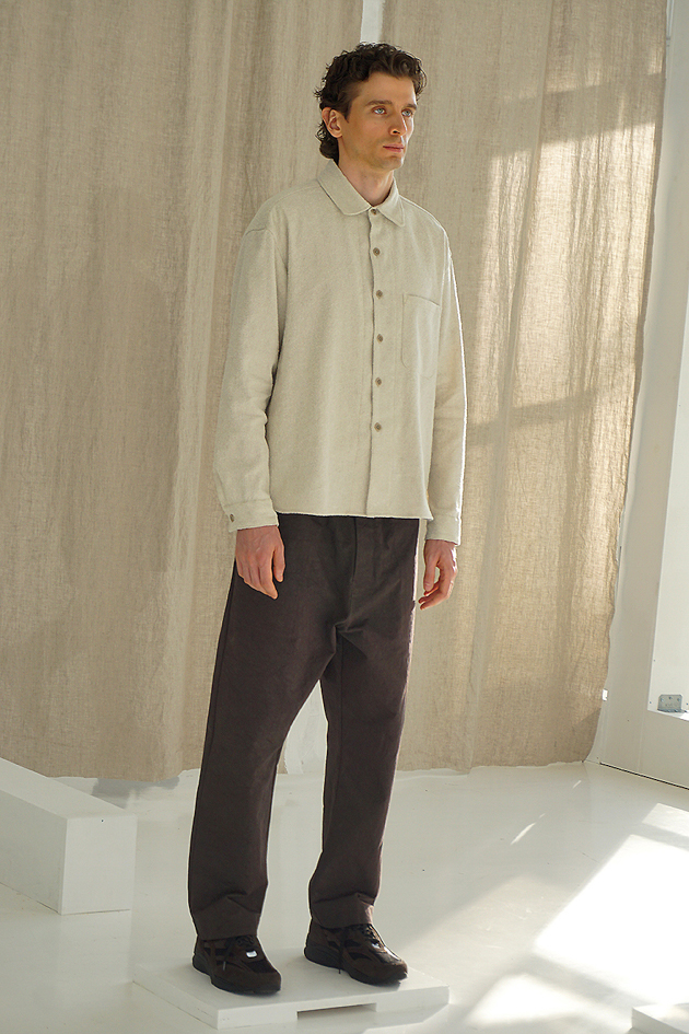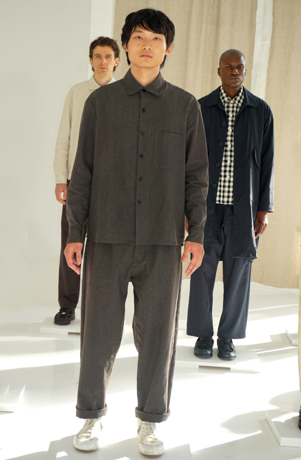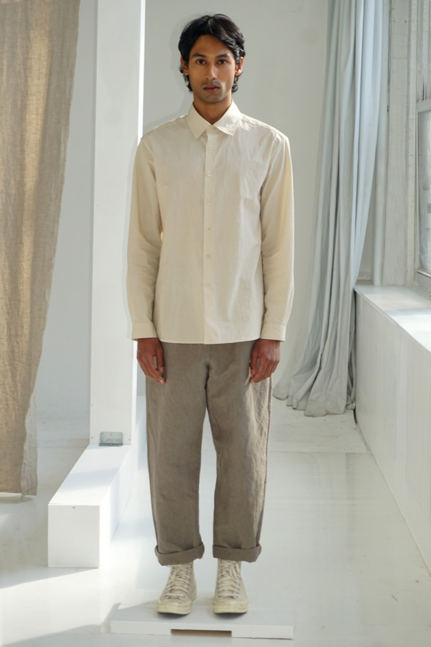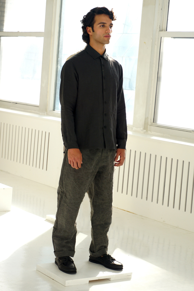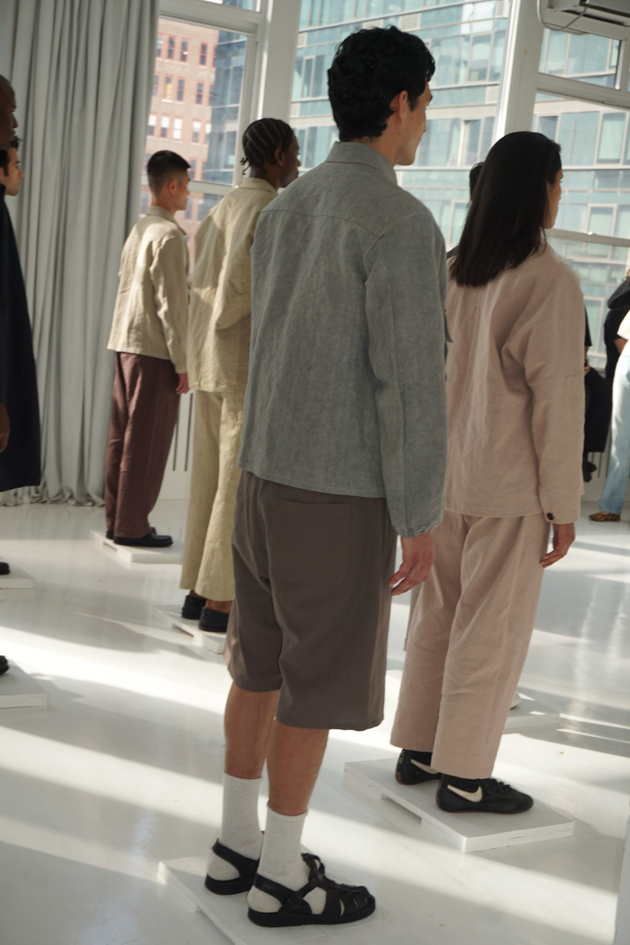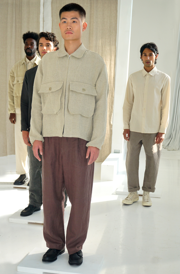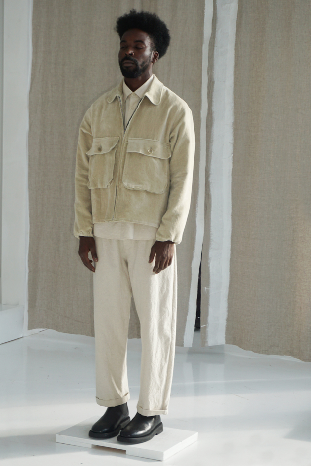 Scene: Of Nothing Presentation. The Brooklyn based clothing brand made by designer Jack Fullerton is designed and produced in house. The brand features a consistent selection of unstructured work jackets, drapey shirts, with comfortable pants. Minimal clothing of maximum quality. Some items are ready to ship while others are made to order. Of Nothing is a continuation of Jacks “meditative and contemplative practices, extending that space through designing, developing, cutting, sewing, and presenting clothes. It precipitates from clouds of ideas from a wide range of fields, paired with the recognition of a missing center. The name is in part a reference to this practice, and it is a half truth. When something is made of nothing, it is of everything.”